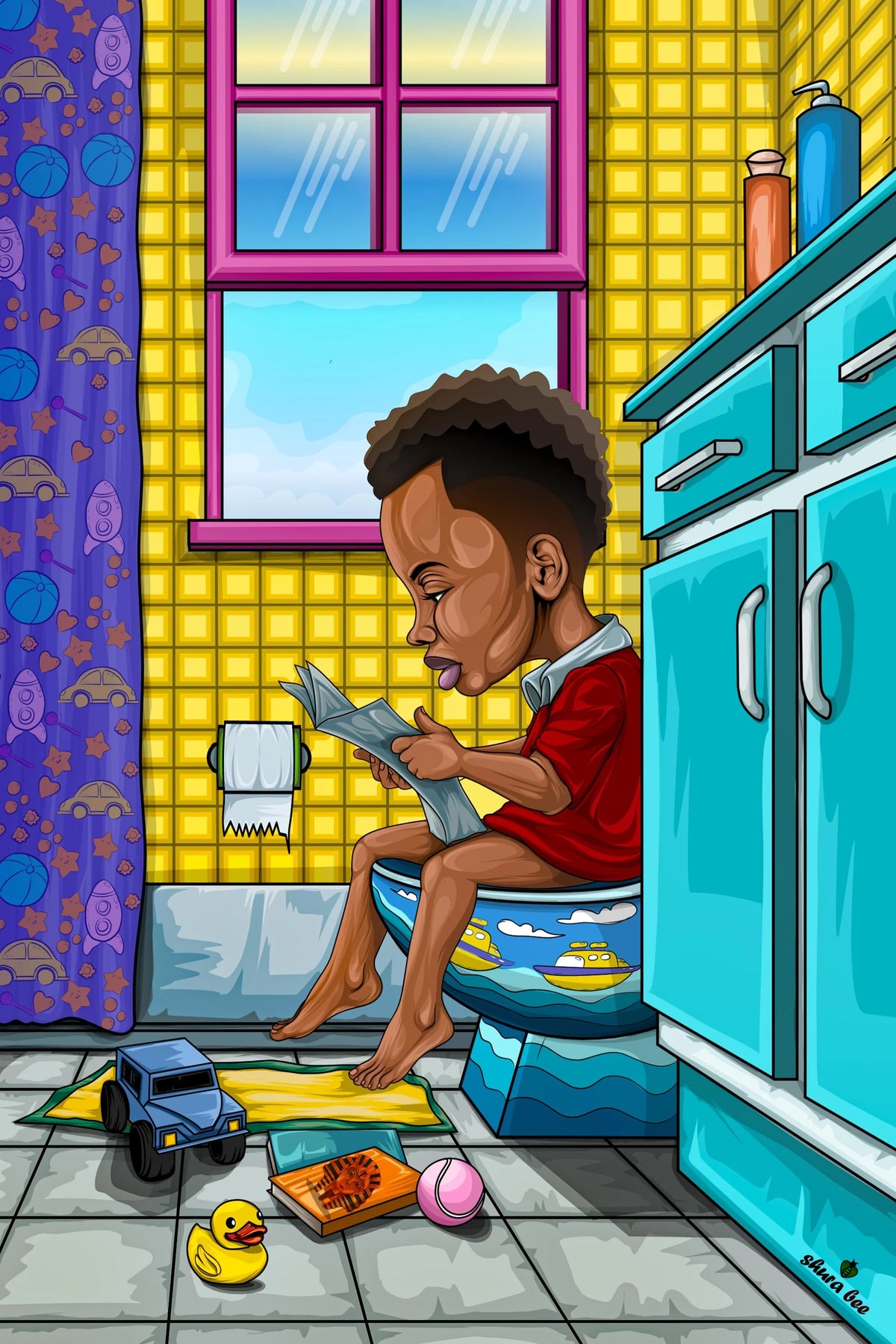 "Quiet Time" offers a delightful glimpse into a moment of youthful contemplation. A young boy, lost in his thoughts and a newspaper, enjoys his peaceful sanctuary surrounded by playful and colorful details.