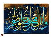 This stunning artwork beautifully combines Arabic calligraphy with modern abstract art. The words "وَإِنَّا صَادِقُونَ", meaning "And indeed, we are truthful," are elegantly displayed in a contemporary style, with vibrant shades of blue and yellow flowing throughout the design.