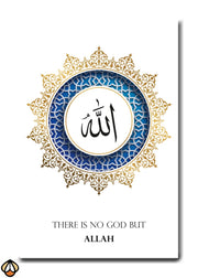 This stunning artwork beautifully features the Arabic calligraphy of "اللَّهُ" (Allah), surrounded by an elegant gold and blue geometric design. The intricate patterns of the border symbolize the vastness of Allah’s creation, while the simple yet powerful phrase "There is no God but Allah" serves as a reminder of the core belief of Islam — the oneness of Allah. The use of blue and gold adds a sense of serenity and divinity to the piece, making it a perfect addition to any space.
