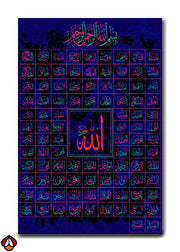 This stunning artwork features the 99 names of Allah (Asma'ul Husna), each representing one of the many attributes of the Almighty. The vibrant and intricate design is a modern representation of these sacred names, thoughtfully arranged around the central name of Allah.