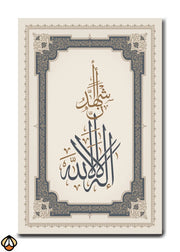This elegant artwork features the Arabic calligraphy of the Shahada, "أشهد أن لا إله إلا الله" (I bear witness that there is no god but Allah), beautifully rendered with graceful lines and intricate details. The calligraphy is framed within a delicate border, adding a sense of harmony and reverence. The use of soft beige and muted gold tones creates a serene and spiritual atmosphere, making this piece perfect for any sacred space.