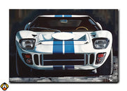 This magnificent artwork showcases the iconic Ford GT40, a true symbol of automotive performance and racing heritage. The sharp contrast of the white body with blue racing stripes exudes speed, precision, and the relentless spirit of competition. A classic among classic cars, the GT40's distinctive design and aggressive styling are captured in stunning detail, making it a perfect tribute to the car that conquered Le Mans.