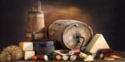 Step back into the charm of rural tradition with this composition featuring wooden barrels, a spread of cheeses, cured meats, fresh vegetables, and artisanal bread. The warm lighting enhances the natural textures, creating a cozy and authentic ambiance.