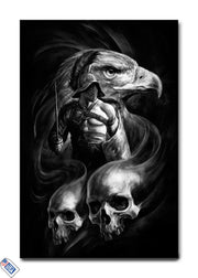 This evocative piece combines the commanding presence of an eagle, the strength of a warrior, and the timeless symbol of mortality—skulls. The monochrome palette highlights the stark beauty of life, death, and power in one striking composition.