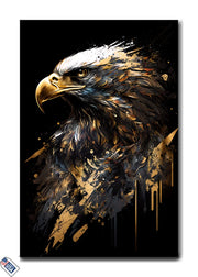 This captivating artwork showcases the regal eagle in all its splendor, with a bold, abstract style blending vibrant strokes of gold, black, and blue. The intense gaze and intricate feather details make it a stunning tribute to strength and freedom.