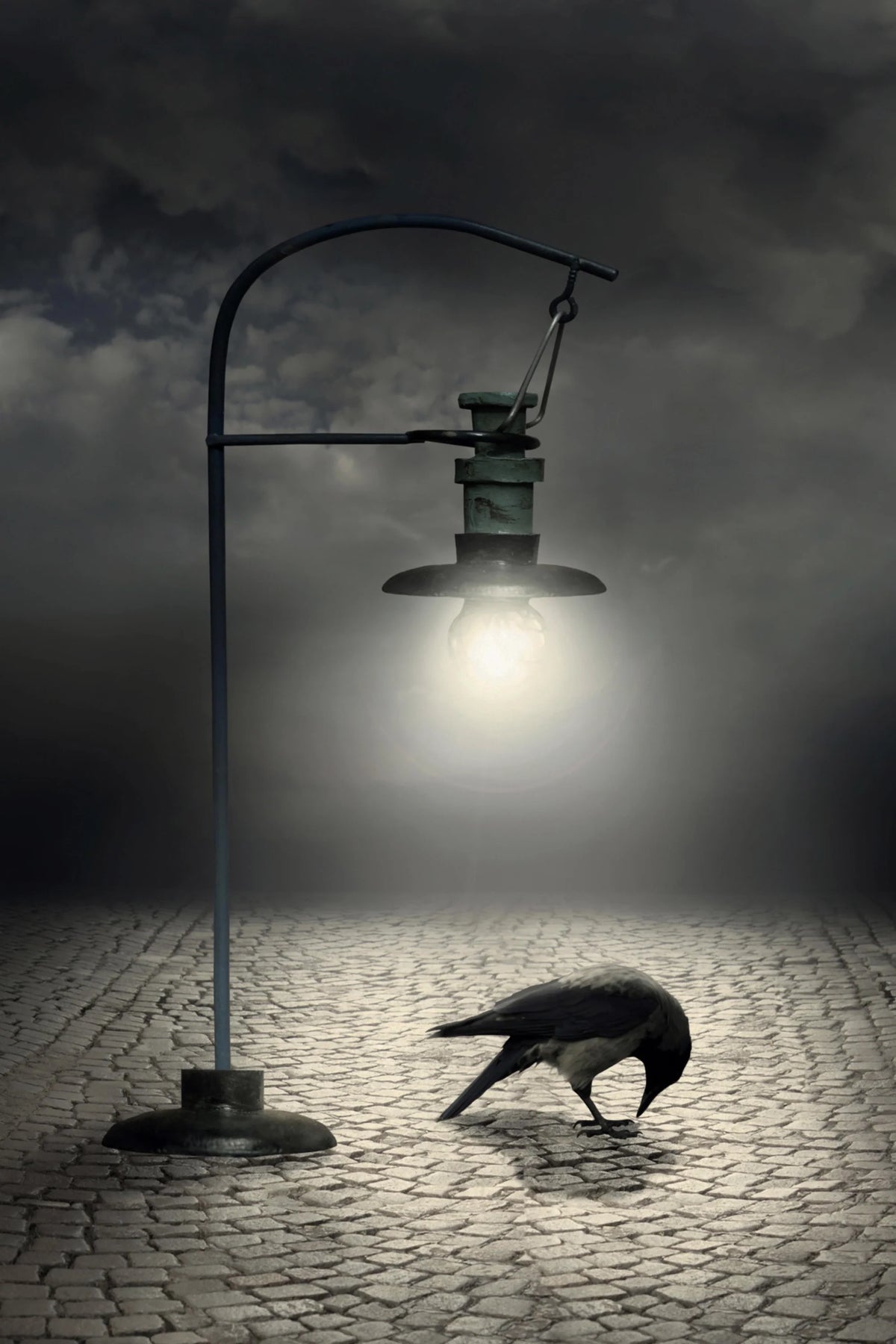 Capture the essence of quiet solitude with this atmospheric artwork. Featuring a dimly lit street lamp casting light on a lone crow against a moody, cloudy backdrop, this piece evokes themes of mystery, reflection, and calm. The textured cobblestone path adds depth and a timeless feel to the scene.