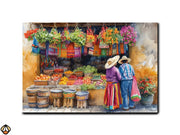 Experience the vibrant essence of a traditional market scene brought to life in this stunning artwork. With an array of colorful produce, flowers, and woven textiles, this piece captures the heart of cultural heritage and everyday beauty.