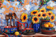 Bring the warmth of a rustic kitchen to your space with this vibrant still-life artwork. Featuring bright sunflowers, colorful ceramics, and fresh fruit, this piece exudes charm, culture, and timeless hospitality.