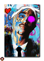 This bold and expressive artwork captures a larger-than-life persona, blending vibrant graffiti aesthetics with profound symbolism. The striking colors, layered text, and emotional undertones tell a story of resilience and enduring presence.