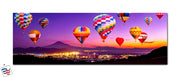 Experience the breathtaking beauty of colorful hot air balloons floating gracefully against a vivid sunset. This artwork captures the charm of an evening festival, where vibrant balloons soar above a glowing cityscape, with majestic mountains completing the horizon.