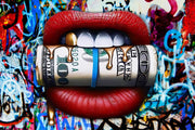 This provocative artwork combines the allure of opulence with bold street art. A striking image of lips gripping a $100 bill dripping with golden accents, set against a graffiti-filled backdrop, captures the interplay of wealth, temptation, and rebellion.