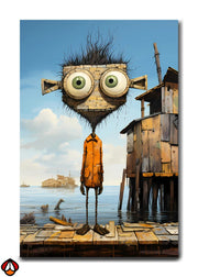 Immerse yourself in the whimsical charm of a quirky dockside figure. With oversized eyes, a scruffy demeanor, and vibrant orange attire, this eccentric character stands as the guardian of a surreal waterfront scene.