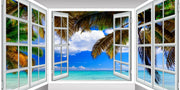 Immerse yourself in the vibrant beauty of this tropical escape. The open window invites you to experience the sparkling turquoise waters and swaying palm trees under a radiant blue sky.