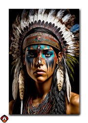 Immerse yourself in the resilience and beauty of a Native American warrior. This artwork portrays a fearless female leader adorned with traditional face paint and an intricately detailed feathered headdress, capturing a balance of elegance and power.