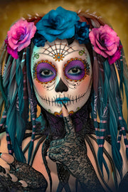 Celebrate the vibrant and mysterious spirit of Día de los Muertos with this mesmerizing artwork. Featuring a woman adorned in intricate sugar skull makeup, with vibrant blue and pink flowers and flowing teal ribbons in her hair, the design radiates beauty and depth. Her gesture of silence adds an air of mystique, perfect for creating a captivating focal point in any space.