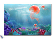 Transform your space with this captivating depiction of ethereal jellyfish gracefully drifting through a vibrant coral reef. This artwork exudes tranquility and the mesmerizing beauty of marine life.