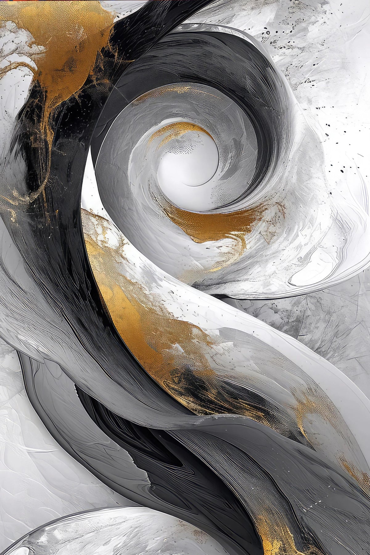 "Ethereal Swirl" captures the mesmerizing flow of movement with a dynamic interplay of black, white, and gold. This abstract masterpiece evokes depth and elegance, making it a stunning focal point in any modern interior.
