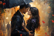 Capture the essence of romance and serenity with this evocative artwork. Featuring a couple walking arm-in-arm down a glistening, lamplit street on a rainy evening, this piece embodies the timeless beauty of quiet companionship.