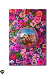 Step into a vibrant world where retro meets nature with this captivating artwork. Featuring a dazzling disco ball surrounded by a vivid explosion of colorful flowers, this piece brings energy and joy to any space.